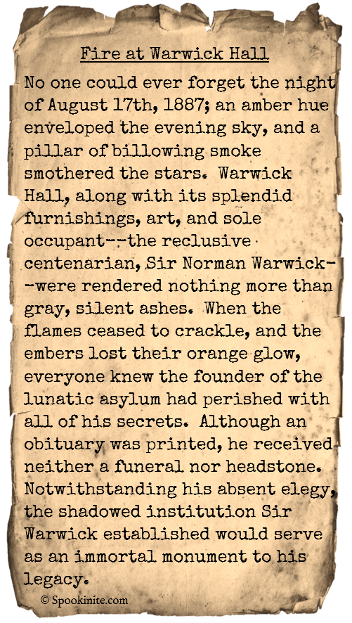 No one could ever forget the night of August 17th, 1887; an amber hue enveloped the evening sky, and a pillar of billowing smoke smothered the stars. Warwick Hall, along with its splendid furnishings, art, and sole occupant—the reclusive centenarian, Sir Norman Warwick—were rendered nothing more than gray, silent ashes. When the flames ceased to crackle, and the embers lost their orange glow, everyone knew the founder of the lunatic asylum had perished with all of his secrets. Although an obituary was printed, he received neither a funeral nor headstone. Notwithstanding his absent elegy, the shadowed institution Sir Warwick established would serve as an immortal monument to his legacy.
