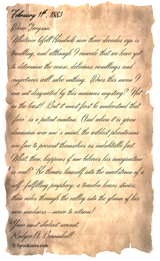 Whatever befell Hemlock over three decades ago is troubling, and although I concede that we have yet to determine the cause, delirious ramblings and conjectures will solve nothing. Does this mean I am not disquieted by this ominous mystery? Not in the least! But it must first be understood that ‘fear’ is a potent emotion. And when it is given dominion over one’s mind, the wildest phantasms are free to present themselves as indubitable fact. What, then, happens if one believes his imagination is real? He throws himself into the maelstrom of a self-fulfilling prophecy; a traveler hears stories, then rides through the valley into the gloom of his own madness—never to return!