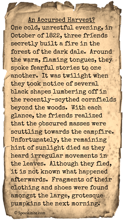 One cold, unrestful evening, in October of 1822, three friends secretly built a fire in the forest of the dark dale. Around the warm, flaming tongues, they spoke fearful stories to one another. It was twilight when they took notice of several black shapes lumbering off in the recently-scythed cornfields beyond the woods. With each glance, the friends realized that the obscured masses were scuttling towards the campfire. Unfortunately, the remaining hint of sunlight died as they heard irregular movements in the leaves. Although they fled, it is not known what happened afterwards. Fragments of their clothing and shoes were found amongst the large, grotesque pumpkins the next morning.