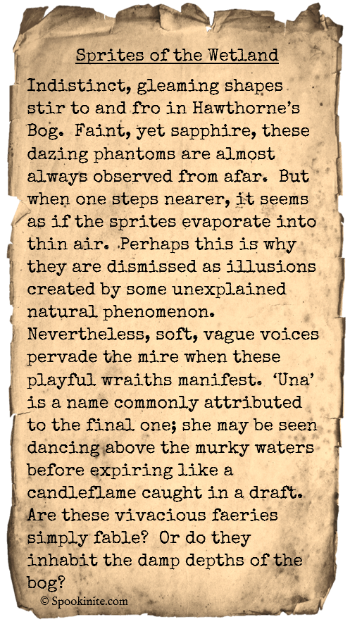 Indistinct, gleaming shapes stir to and fro in Hawthorne’s Bog. Faint, yet sapphire, these dazing phantoms are almost always observed from afar. But when one steps nearer, it seems as if the sprites evaporate into thin air. Perhaps this is why they are dismissed as illusions created by some unexplained natural phenomenon. Nevertheless, soft, vague voices pervade the mire when these playful wraiths manifest. ‘Una’ is a name commonly attributed to the final one; she may be seen dancing above the murky waters before expiring like a candleflame caught in a draft. Are these vivacious faeries simply fable? Or do they inhabit the damp depths of the bog?
