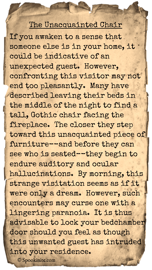 If you awaken to a sense that someone else is in your home, it could be indicative of an unexpected guest. However, confronting this visitor may not end too pleasantly. Many have described leaving their beds in the middle of the night to find a tall, Gothic chair facing the fireplace. The closer they step toward this unacquainted piece of furniture—and before they can see who is seated—they begin to endure auditory and ocular hallucinations. By morning, this strange visitation seems as if it were only a dream. However, such encounters may curse one with a lingering paranoia. It is thus advisable to lock your bedchamber door should you feel as though this unwanted guest has intruded into your residence.