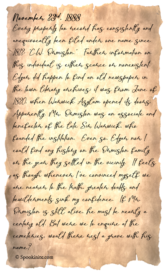 Every property tax record has consistently and unequivocally been filed under one name since 1812: ‘C.W. Ormiston.’ Further information on this individual is either scarce or nonexistent. Edgar did happen to find an old newspaper in the town library archives; it was from June of 1820, when Warwick Asylum opened its doors. Apparently, Mr. Ormiston was an associate and benefactor of the late Sir Warwick, who founded the institution. Even so, Edgar nor I could find any history on the Ormiston family or the year they settled in the vicinity. It feels as though whenever I’ve convinced myself we are nearer to the truth, greater doubts and bewilderments sink my confidence. If Mr. Ormiston is still alive, he must be nearly a century old. But were we to enquire at the cemeteries, would there rest a grave with his name?