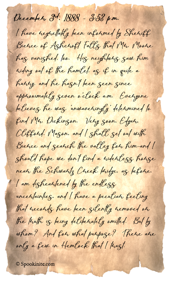 I have regrettably been informed by Sheriff Bierce of Ashcroft Falls that Mr. Moore has vanished, too. His neighbors saw him riding out of the hamlet, as if in quite a hurry, and he hasn’t been seen since approximately seven o’clock a.m. Everyone believes he was ‘unwaveringly’ determined to find Mr. Dickinson. Very soon, Edgar, Clifford, Mason, and I shall set out with Bierce and search the valley for him—and I should hope we don’t find a riderless horse near the Schwartz Creek bridge, as before. I am disheartened by the endless uncertainties, and I have a peculiar feeling that records have been silently removed or the truth is being deliberately omitted. But by whom? And for what purpose? There are only a few in Hemlock that I trust.
