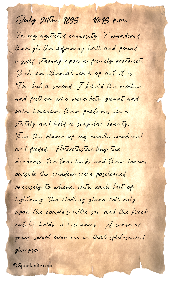 In my agitated curiosity, I wandered through the adjoining hall and found myself staring upon a family portrait. Such an ethereal work of art it is. For but a second, I beheld the mother and father, who were both gaunt and pale; however, their features were stately and held a singular beauty. Then the flame of my candle weakened and faded. Notwithstanding the darkness, the tree limbs and their leaves outside the window were positioned precisely to where, with each bolt of lightning, the fleeting glare fell only upon the couple’s little son and the black cat he holds in his arms. A sense of grief swept over me in that split-second glimpse.