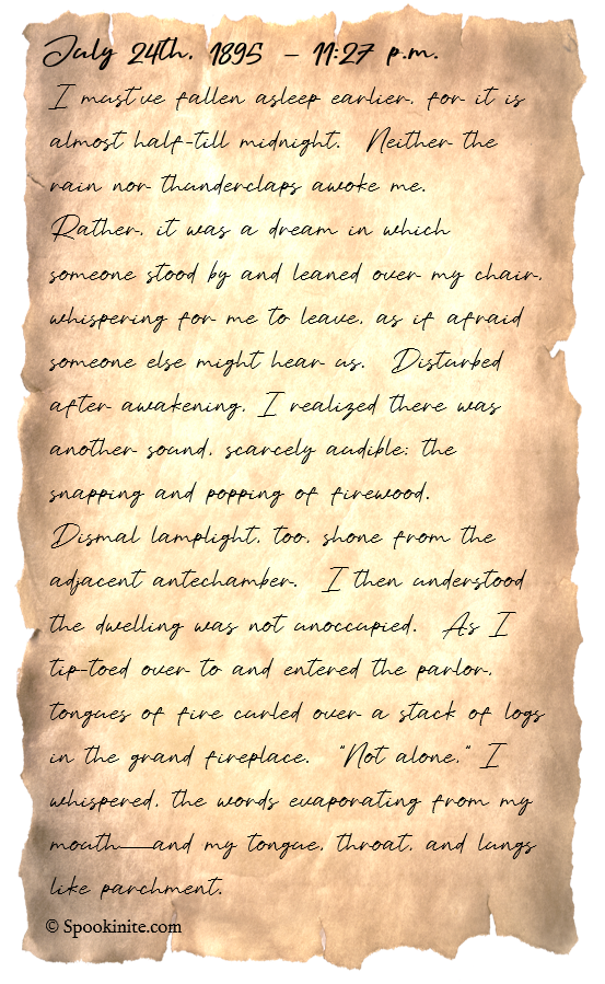 I must’ve fallen asleep earlier, for it is almost half-till midnight. Neither the rain nor thunderclaps awoke me. Rather, it was a dream in which someone stood by and leaned over my chair, whispering for me to leave, as if afraid someone else might hear us. Disturbed after awakening, I realized there was another sound, scarcely audible: the snapping and popping of firewood. Dismal lamplight, too, shone from the adjacent antechamber. I then understood the dwelling was not unoccupied. As I tip-toed over to and entered the parlor, tongues of fire curled over a stack of logs in the grand fireplace. “Not alone,” I whispered, the words evaporating from my mouth—and my tongue, throat, and lungs like parchment.