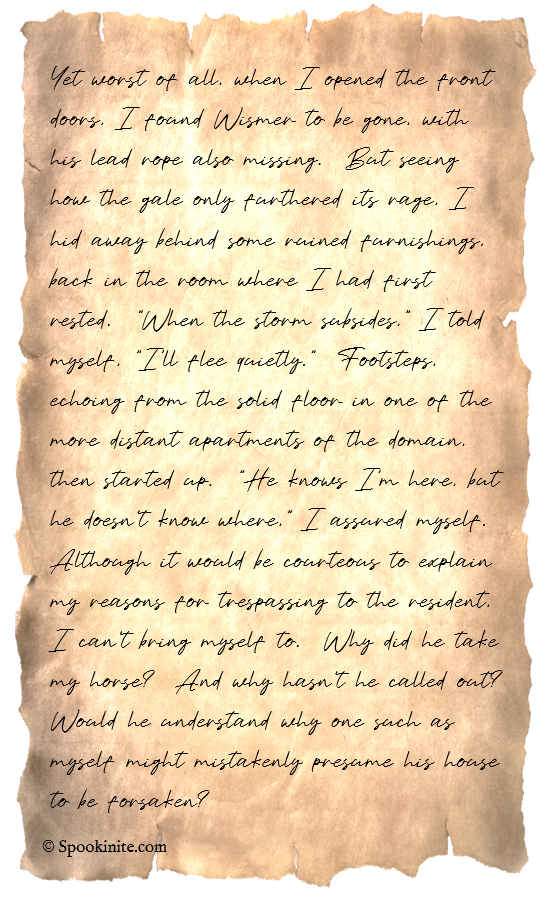 Yet worst of all, when I opened the front doors, I found Wismer to be gone, with his lead rope also missing. But seeing how the gale only furthered its rage, I hid away behind some ruined furnishings, back in the room where I had first rested. “When the storm subsides,” I told myself, “I’ll flee quietly.” Footsteps, echoing from the solid floor in one of the more distant apartments of the domain, then started up. “He knows I’m here, but he doesn’t know where,” I assured myself. Although it would be courteous to explain my reasons for trespassing to the resident, I can’t bring myself to. Why did he take my horse? And why hasn’t he called out? Would he understand why one such as myself might mistakenly presume his house to be forsaken?