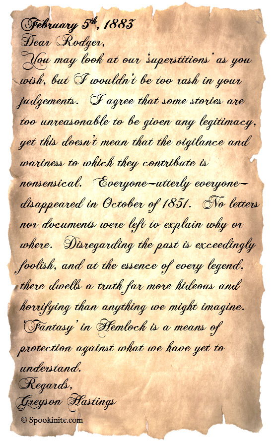You may look at our ‘superstitions’ as you wish, but I wouldn’t be too rash in your judgements. I agree that some stories are too unreasonable to be given any legitimacy, yet this doesn’t mean that the vigilance and wariness to which they contribute is nonsensical. Everyone—utterly everyone—disappeared in October of 1851. No letters nor documents were left to explain why or where. Disregarding the past is exceedingly foolish, and at the essence of every legend, there dwells a truth far more hideous and horrifying than anything we might imagine. ‘Fantasy’ in Hemlock is a means of protection against what we have yet to understand.