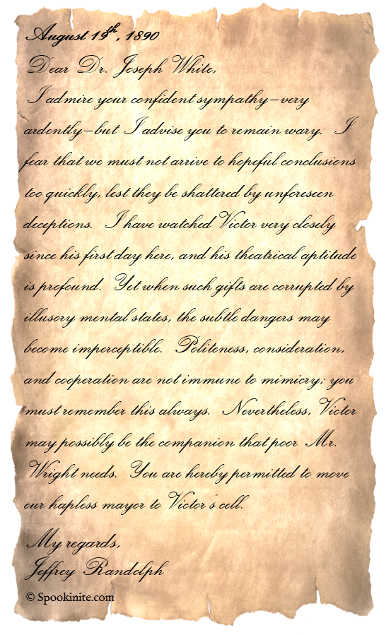 I admire your confident sympathy—very ardently—but I advise you to remain wary. I fear that we must not arrive to hopeful conclusions too quickly, lest they be shattered by unforeseen deceptions. I have watched Victor very closely since his first day here, and his theatrical aptitude is profound. Yet when such gifts are corrupted by illusory mental states, the subtle dangers may become imperceptible. Politeness, consideration, and cooperation are not immune to mimicry; you must remember this always. Nevertheless, Victor may possibly be the companion that poor Mr. Wright needs. You are hereby permitted to move our hapless mayor to Victor’s cell.