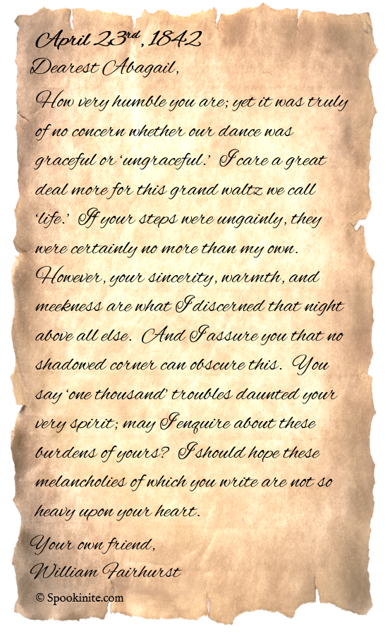 How very humble you are; yet it was truly of no concern whether our dance was graceful or ‘ungraceful.’ I care a great deal more for this grand waltz we call ‘life.’ If your steps were ungainly, they were certainly no more than my own. However, your sincerity, warmth, and meekness are what I discerned that night above all else. And I assure you that no shadowed corner can obscure this. You say ‘one thousand’ troubles daunted your very spirit; may I enquire about these burdens of yours? I should hope these melancholies of which you write are not so heavy upon your heart.