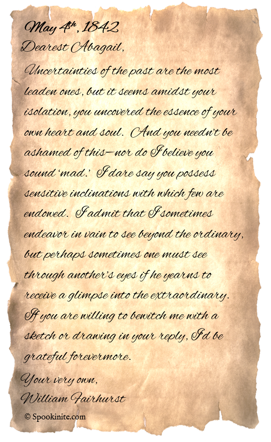 Uncertainties of the past are the most leaden ones, but it seems amidst your isolation, you uncovered the essence of your own heart and soul. And you needn’t be ashamed of this—nor do I believe you sound ‘mad.’ I dare say you possess sensitive inclinations with which few are endowed. I admit that I sometimes endeavor in vain to see beyond the ordinary, but perhaps sometimes one must see through another’s eyes if he yearns to receive a glimpse into the extraordinary. If you are willing to bewitch me with a sketch or drawing in your reply, I’d be grateful forevermore.